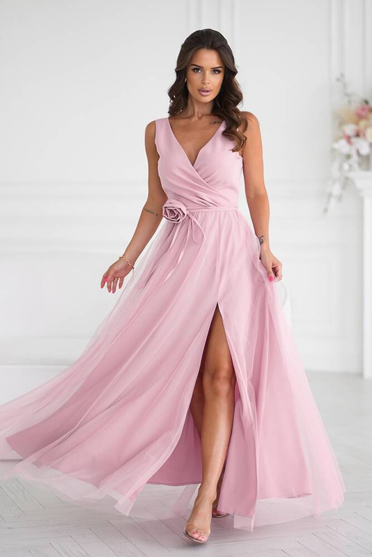 ( ilość produktów: 247 )DŁUGA SUKIENKA Z PASKIEM Z RÓŻYCZKĄ- pudrowy