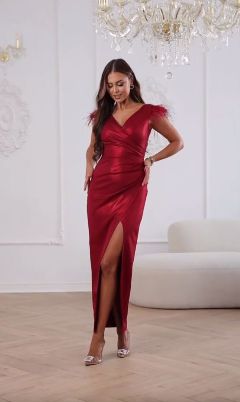 Długa taliowana sukienka Samira bordowa z rozcięciem odsłaniającym nogę.