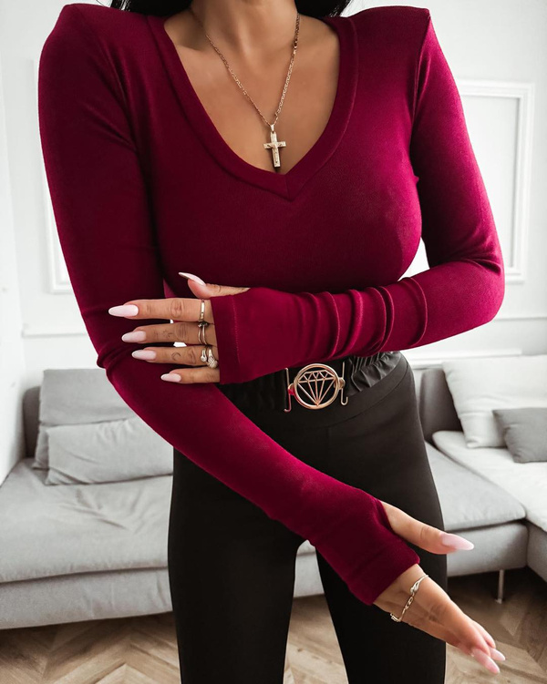 Elegancka bordowa bluzka damska Veronica z przekładanym dekoltem i długim rękawem.