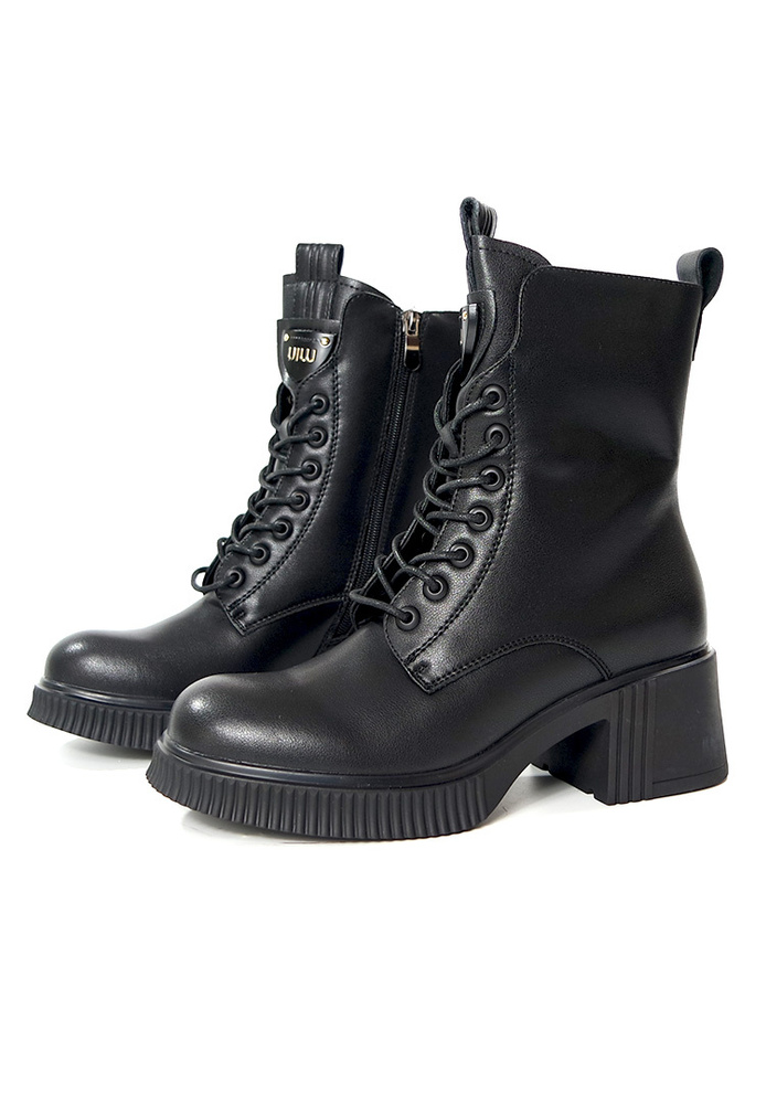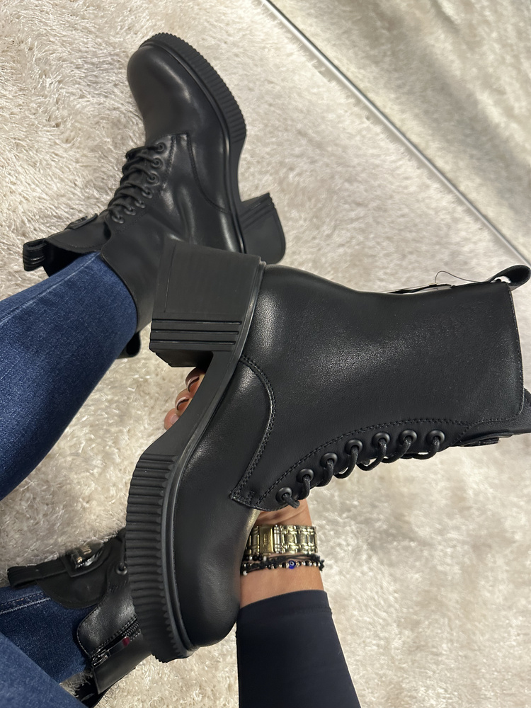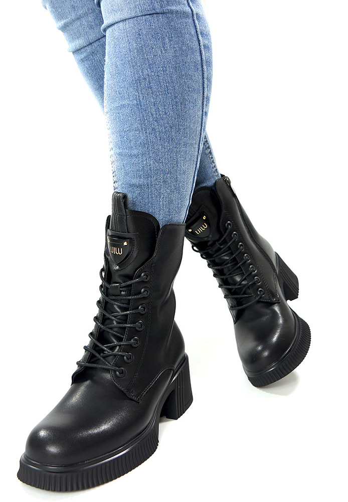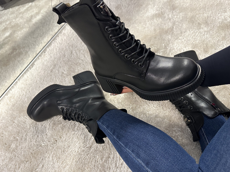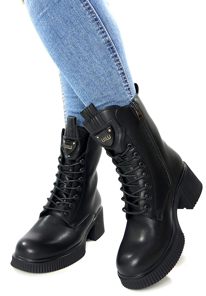 Efektowne botki w modnym fasonie to z pewnością idealny wybór do wielu stylizacji.Damskie botki wykonane z naturalnej skóry w czarnym kolorze. Prosta cholewka o gładkiej powierzchni została zestawiona z sznurowaniem, które dodaje całości lekkości i podkreśla nowoczesny charakter buta. Model osadzono na masywnym, kwadratowym obcasie i pogrubionej podeszwie o wyraźnej fakturze, dzięki czemu zyskuje on wyrazistą sylwetkę.Zapinane na zamek oraz dodatkowo posiadają sznurowanie. Środek ocieplony miłym w dotyku kocem obuwniczym. Koniecznie powinnaś je mieć w swojej jesienno-zimowej szafie! To połączenie klasyki z modnym akcentem, które sprawdzi się zarówno w codziennych, jak i bardziej odważnych stylizacjach.