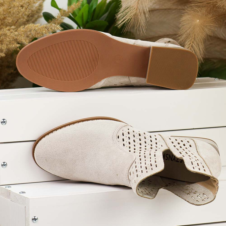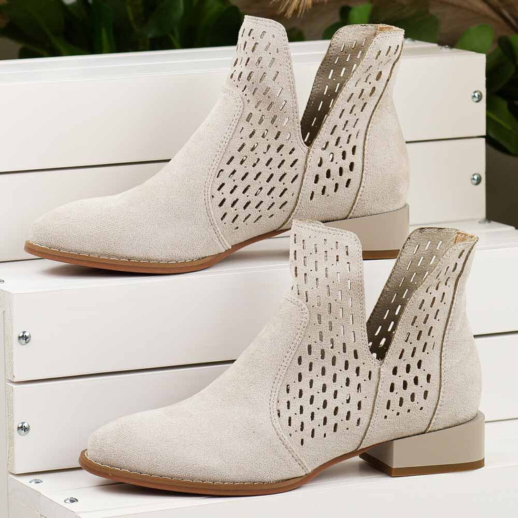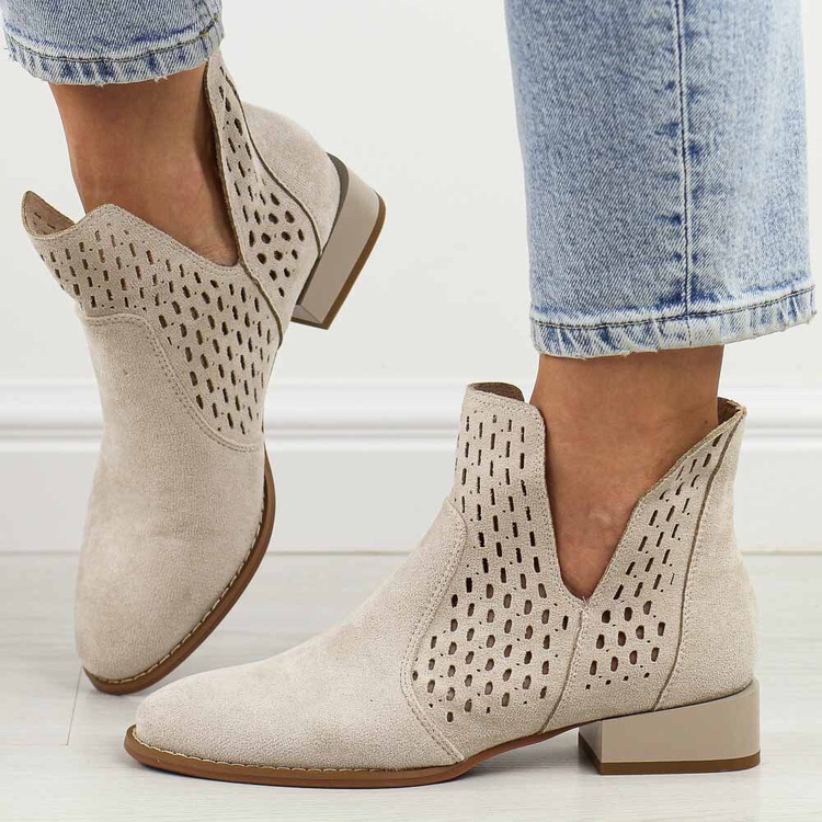 Te beżowe ażurowe botki damskie na obcasie są idealnym wyborem na wiosnę, jesień oraz mniej upalne dni letnie, a także na różne okazje. Ich cholewka wykonana z materiału zamszopodobnego. Ażurowany design sprawia, że buty są przewiewne, co przyczynia się do wygody noszenia przez dłuższy czas.Wkładka skórzana gwarantuje miękkość i komfort podczas użytkowania, a umiarkowanie niski obcas zapewnia stabilność i wygodę.Te pełnowartościowe botki są starannie wykonane i cechują się wysoką trwałością. Doskonale komponują się zarówno ze spodniami, jak i sukienkami, uzupełniając różnorodne stylizacje. Dzięki standardowej tęgości, dopasowują się do większości stóp, zapewniając wygodę przez cały dzień.