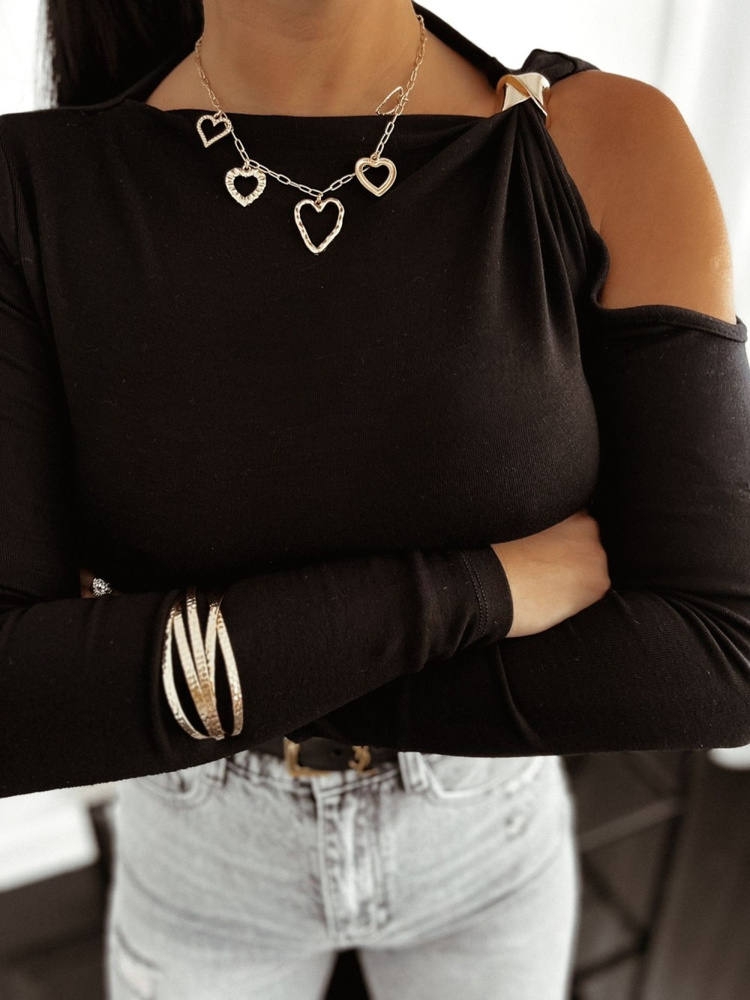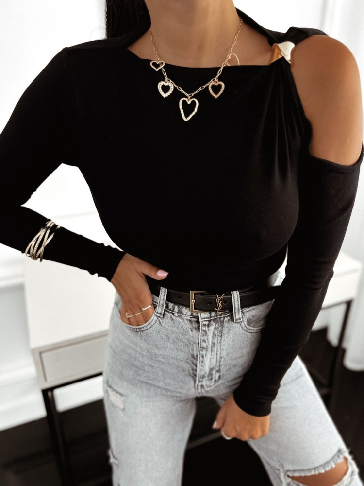 Dopasowana bluzka z długim rękawem.Wykonana z przyjemnego materiału, która doskonale dopasuje się do sylwetki.Dopasowany fason wraz z elastycznym materiałem atrakcyjnie podkreśli atuty sylwetki.Posiada zabudowany dekolt z wycięciem na ramieniu, który dodaje zmysłowego akcentu.Model wyróżnia się tłoczonym, biżuteryjnym zdobieniem tworzącym subtelne marszczenia.