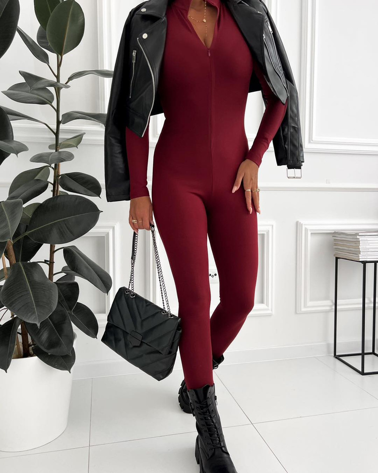Długi dopasowany kombinezon z suwakiem -bordowy