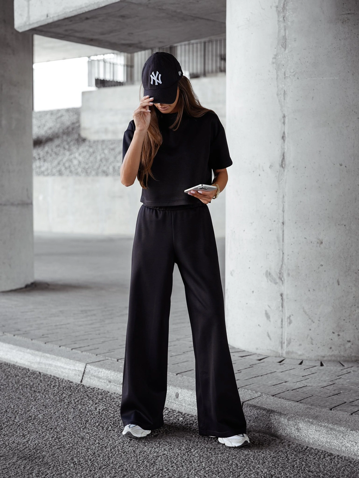 Połączenie bluzki o długości short ze spodniami o szerokim kroju. Basicowy, luźny styl.