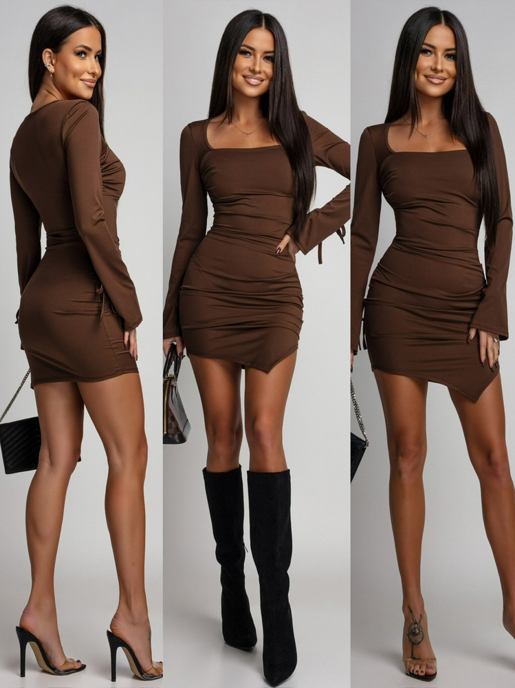 ELEGANCKA MINI DOPASOWANA SUKIENKA z długim rekawm Victoria mleczna czekolada