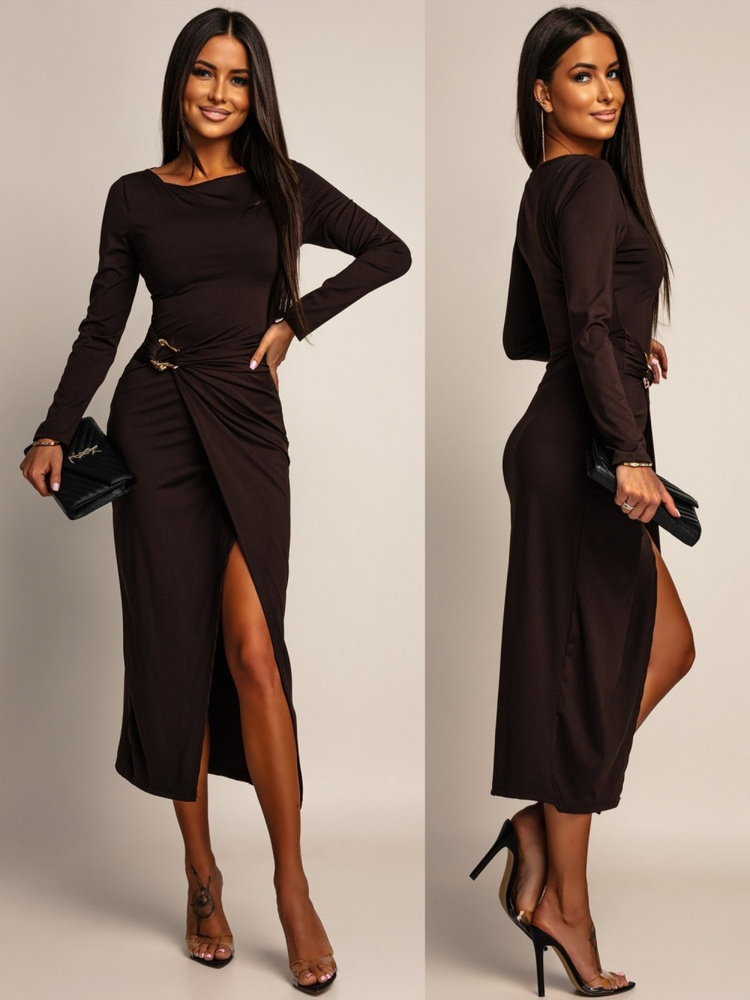 Sukienka o długości midi to ponadczasowy element kobiecej garderoby.Dopasowany fason z elastycznym materiałem atrakcyjnie podkreśli atuty figury.Sukienka w eleganckim wydaniu sprawdzi się na liczne okoliczności.Wykonana z elastycznego materiału, który efektownie podkreśli atuty figury.Zabudowany dekolt w łódkę stanowi uniwersalny wybór dla każdej kobiety.Wyróżnia się dołem szytym na zakładkę i biżuteryjnym zdobieniem w talii.