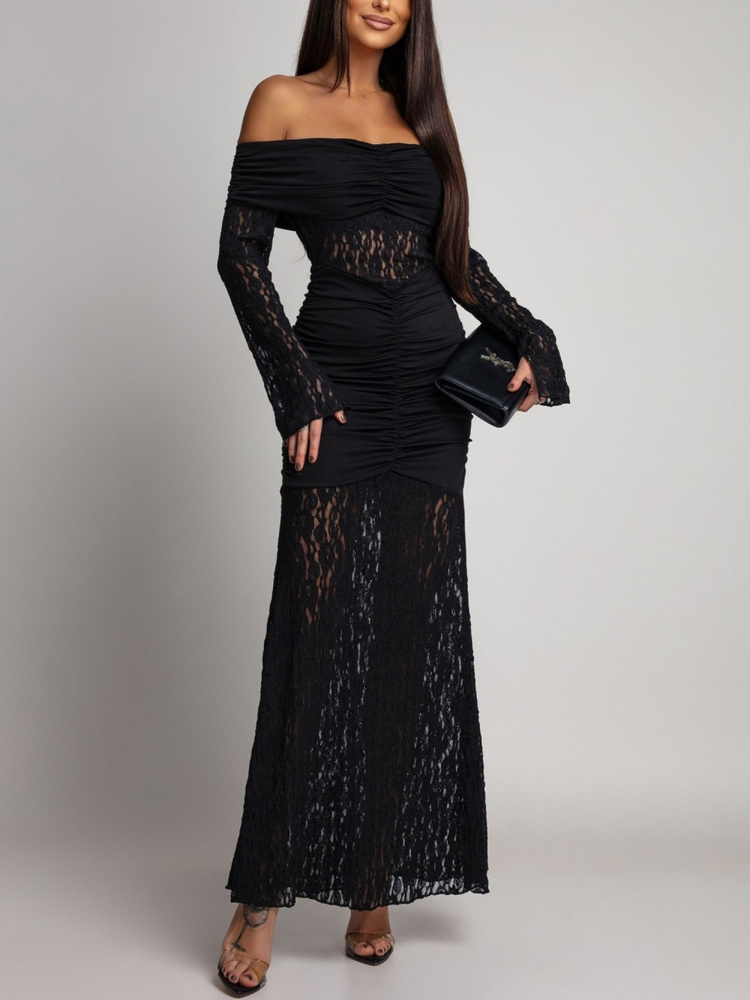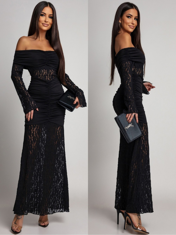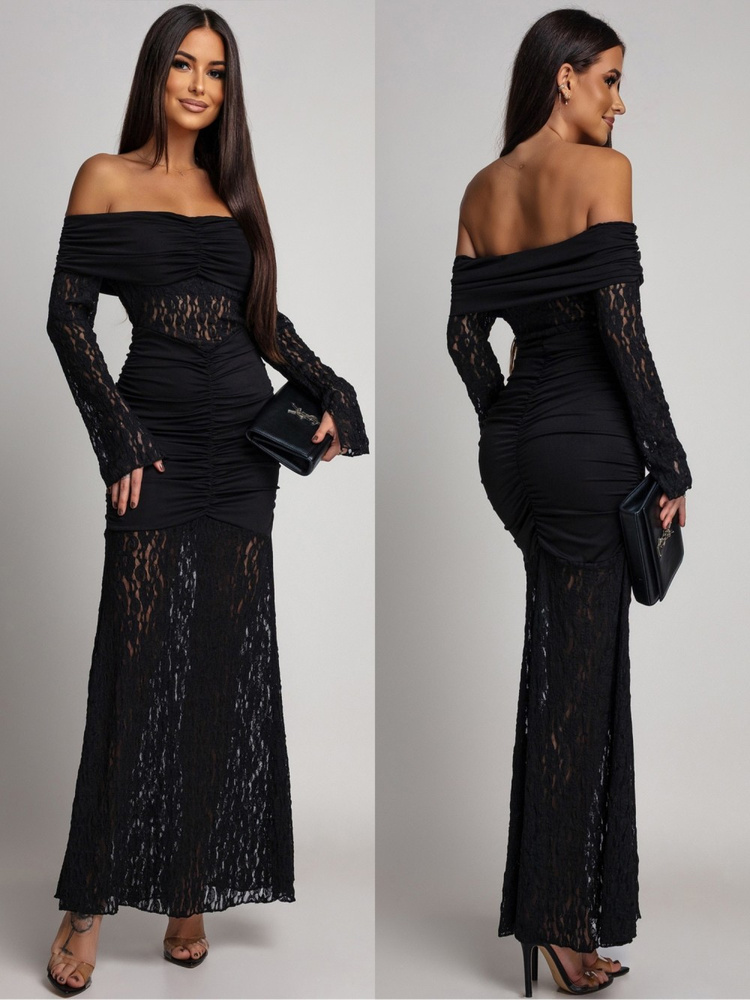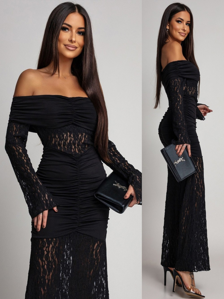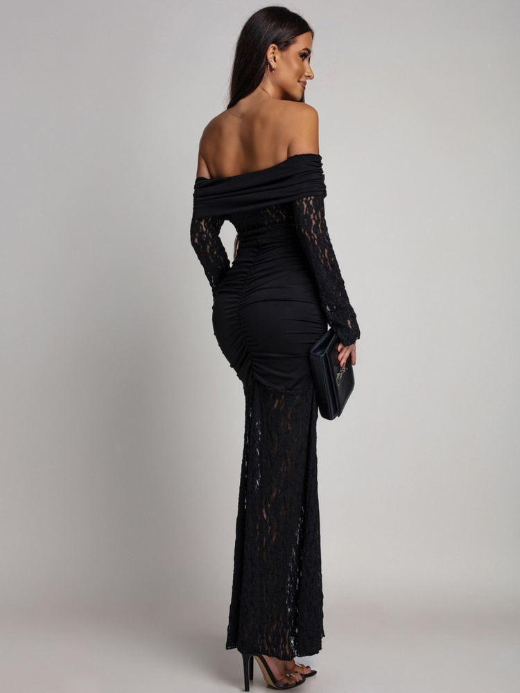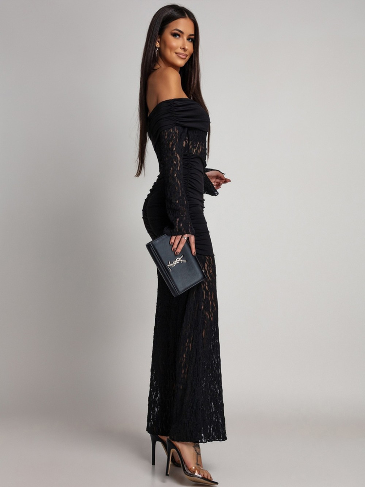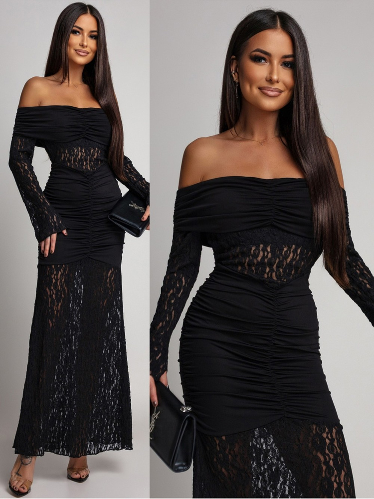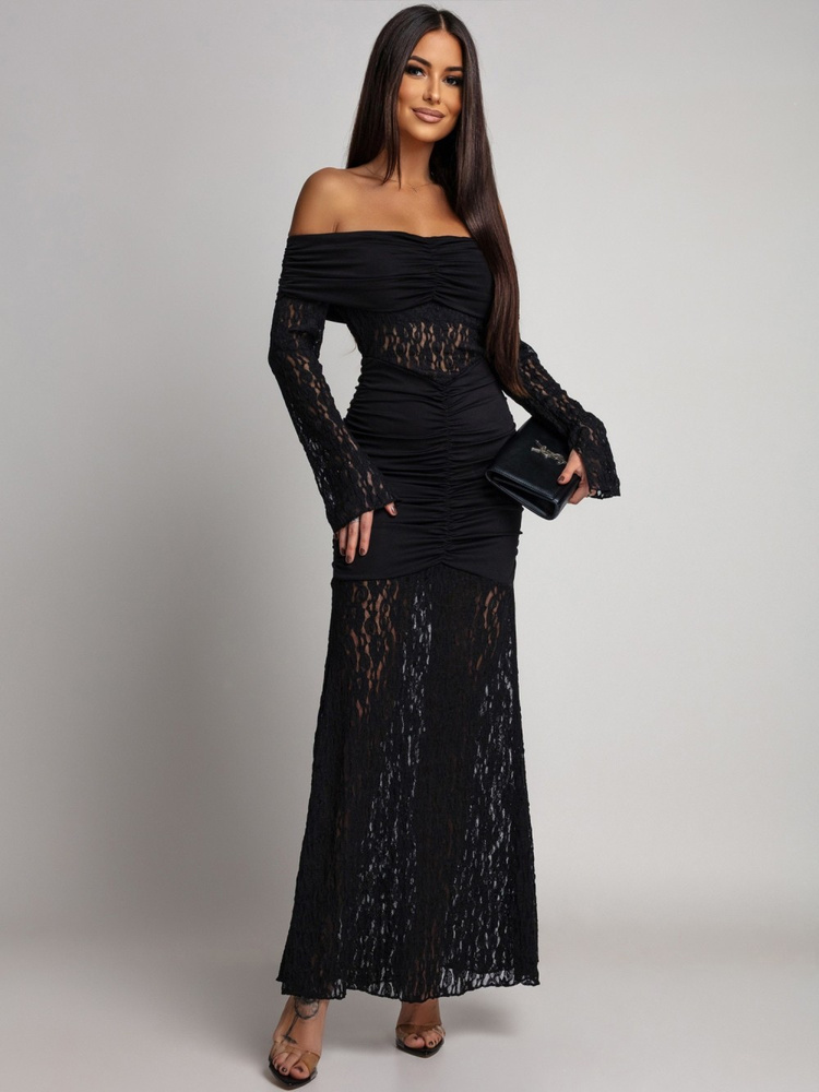 Dopasowana sukienka maxi z długim rękawem. Wykonana z łączonych materiałów - elastycznej tkaniny oraz koronki. Niezwykle kobiecy krój urozmaicono marszczeniami podkreślającymi sylwetkę. Fason z odsłoniętymi ramionami podkreśla elegancki charakter modelu.