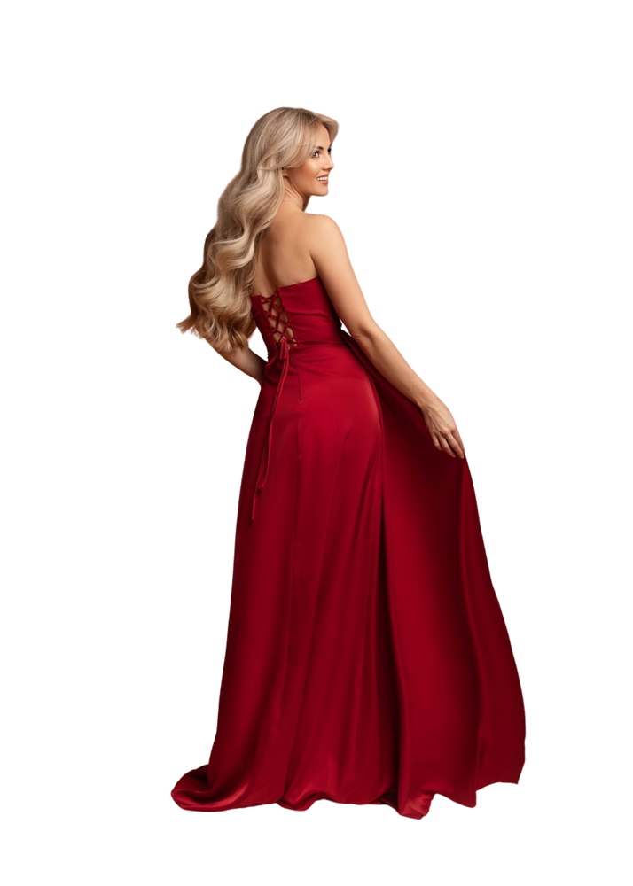 Zachwyć wszystkich w tej olśniewającej czerwonej sukni wieczorowej! Połączenie koronkowego gorsetu z cekinowymi zdobieniami i satynowej spódnicy z efektownym rozcięciem sprawia, że to idealny wybór na wesele, studniówkę, bale i eleganckie przyjęcia.