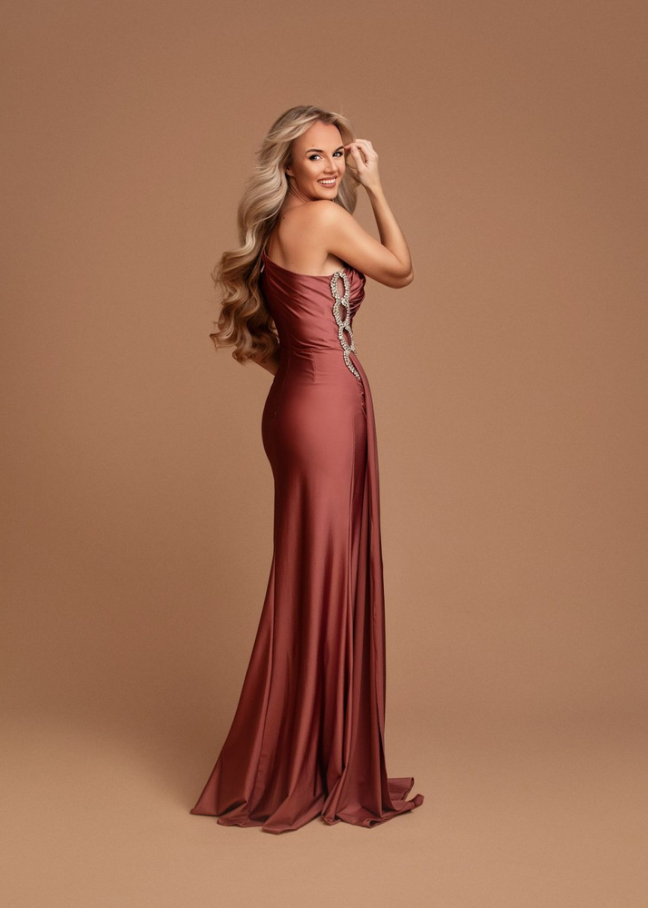 Długa satynowa sukienka wieczorowa na jedno ramię w kolorze indyjskim