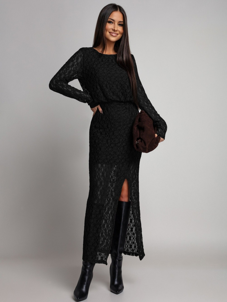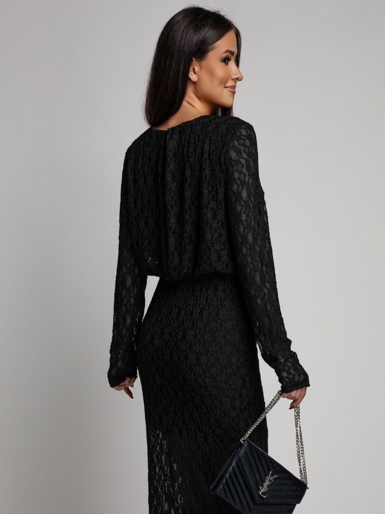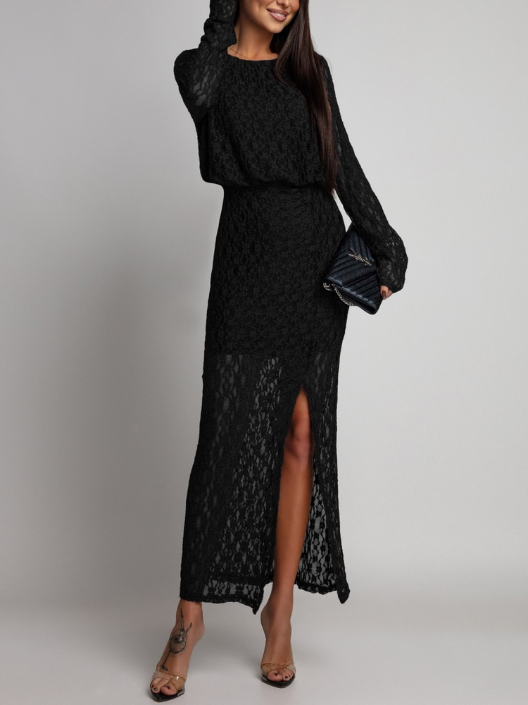 Koronkowa sukienka na długi rękaw. Model wykonany z elastycznego, przyjemnego w dotyku materiału, który efektownie dopasowuje się do sylwetki. Wszyta w talii gumka subtelnie podkreśla kobiece kształty, a rozcięcie na nodze dodaje sylwetce lekkości i zmysłowego charakteru. Z tyłu sukienka zapinana jest na drobny guzik, co stanowi delikatne i kobiece wykończenie całości.Model został wyposażony w podszewkę.