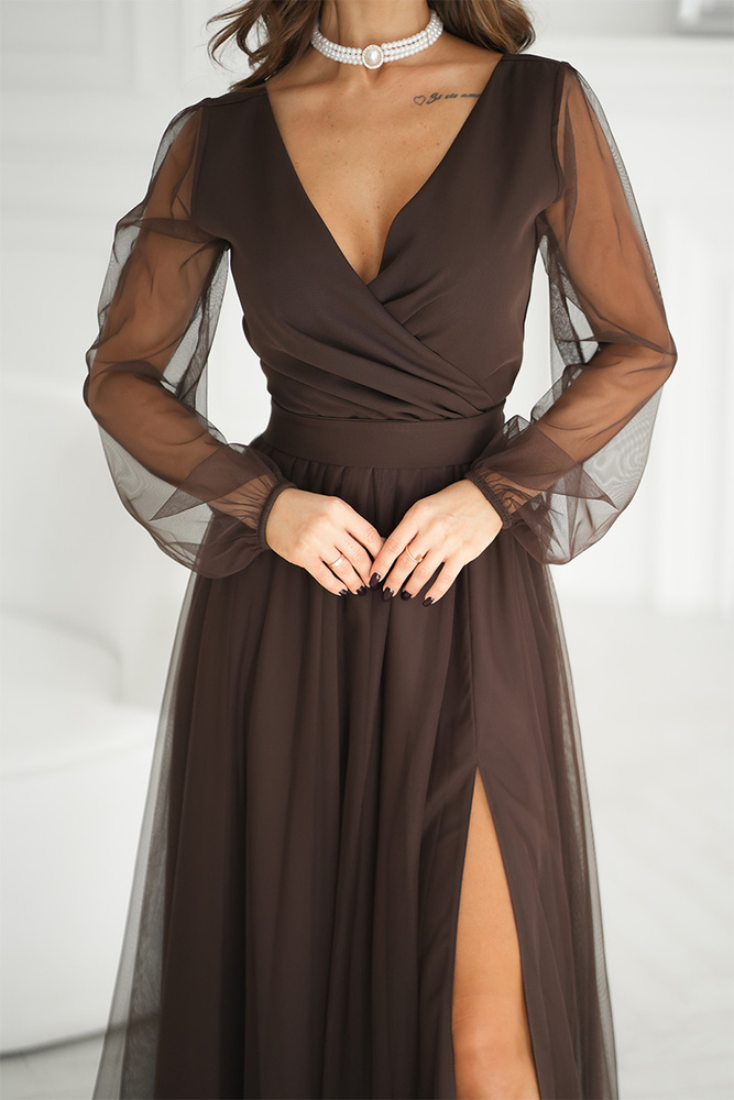 ELEGANCKA SUKIENKA MAXI W Z DŁUGIM RĘKAWEM- czekoladowy