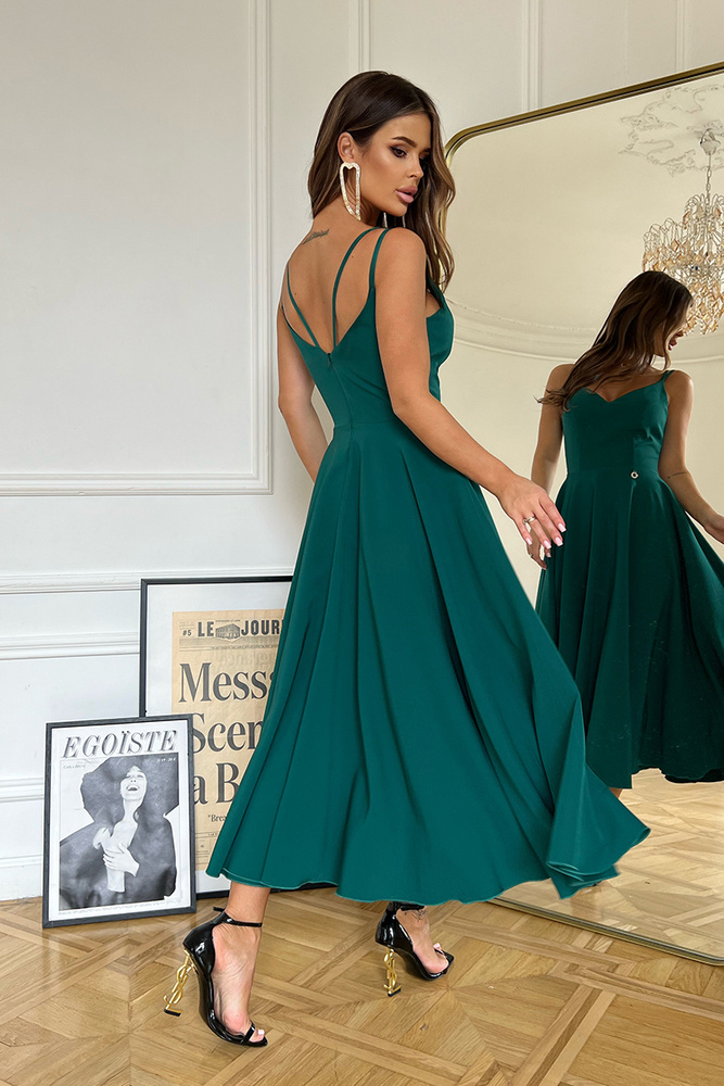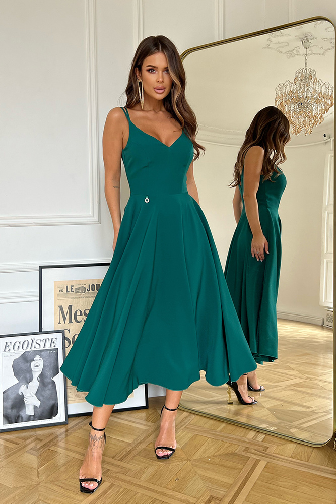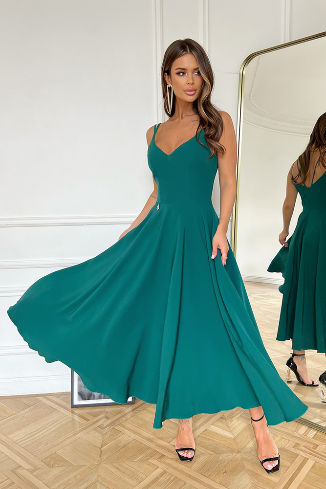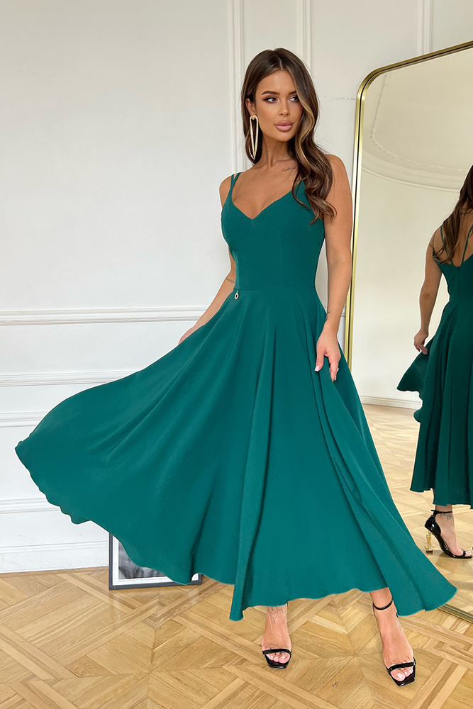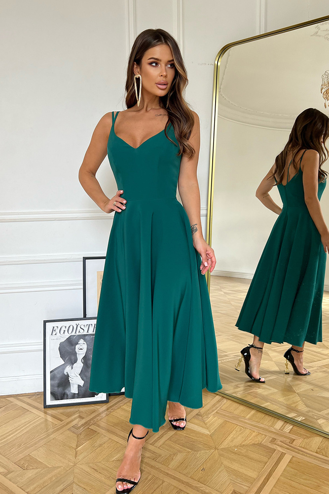 Sukienka midi na ramiączkach lekko rozkloszowana. Góra kreacji na cieniutkich ramiączkach, idealnie dopasowana w talii. Ramiona jak i plecy odsłonięte. Model dodający szyku i kobiecości.